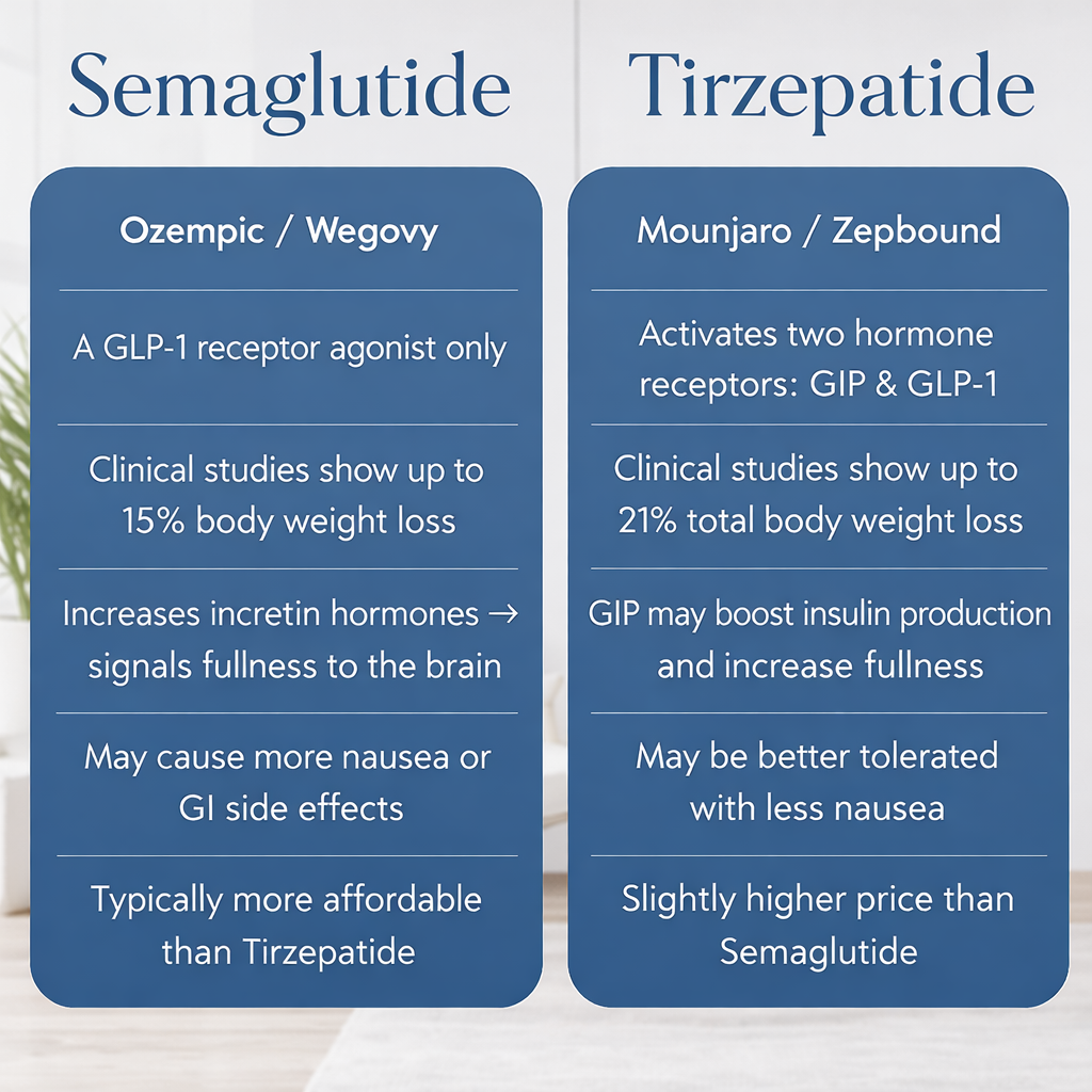 Both semaglutide and tirzepatide are effective; the right choice depends on your priorities and medical situation. Key considerations: Cost: Semaglutide is typically more budget‑friendly.
